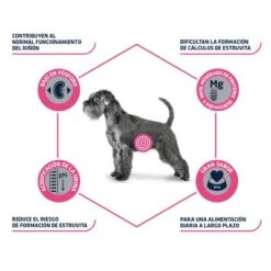 Alimento dietético completo para perros con álculos de estruvita, contenido controlado de minerales y proteÃnas, acidificantes de la orina, sabor delicioso.