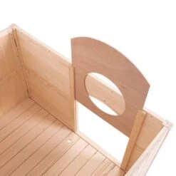 La caseta tiene un revestimiento protector inocuo, también la puedes instalar en el exterior, en zona protegida de las inclemencias y aplicando anteriormente un producto protector de madera. Además, como se puede plegar fácilmente la podrás colocar dentro cuando lo necesites, solo tienes que desdoblar las paredes, el suelo y el techo para colocarla en el lugar que desees.
