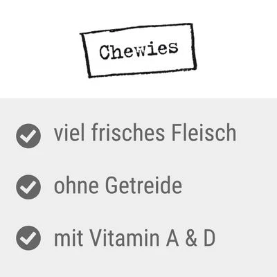 Pero el pack variado Chewies Salametti ofrece mucho más que solo un sabor delicioso y un alto contenido proteico. Enriquecidos con vitaminas A y D3, estos sustanciosos snacks complementan de manera positiva una dieta equilibrada. Además, puedes estar seguro de que no se realizan pruebas en animales ni se utilizan ingredientes modificados genéticamente en su fabricación. Con el pack variado Chewies Salametti, ¡cada bocado se convierte en una celebración para tu mascota!